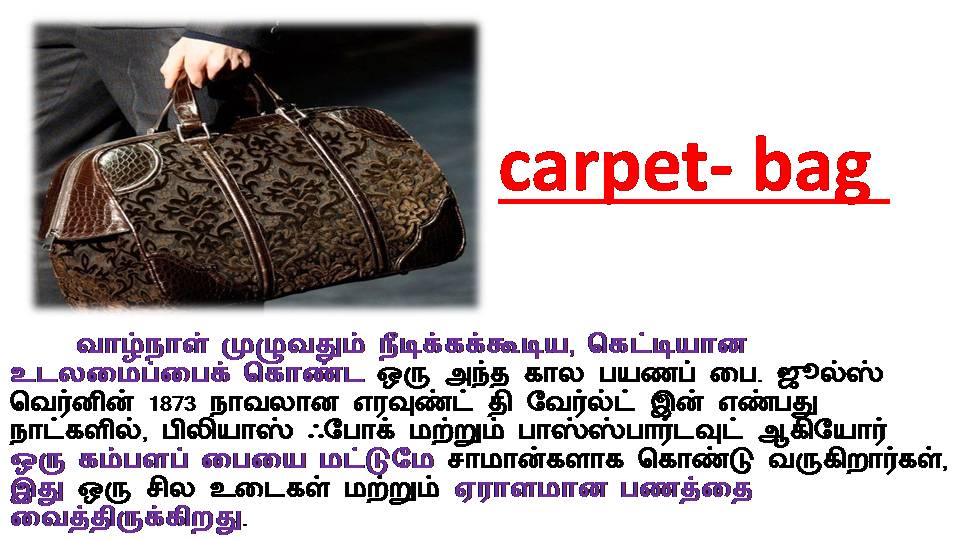 – Mr. Phileas Fogg left London with very little luggage. All his money was in the carpet bag.[திரு. பிலியாஸ் ஃபோக் மிகக் குறைவான சாமான்களுடனேயே லண்டனை விட்டுச் சென்றார். அவரது பணம் அனைத்தும் கம்பளப் பையில் இருந்தது.]